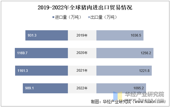 从进出口商业环境来看,近年来全球猪肉进出口规模全体呈增加的态势。据材料显示,2022年全球猪肉进口量为989。1万吨,同比下降14。8%;出口量为1095。2万吨,同比下降10。4%。