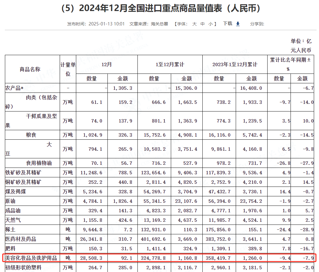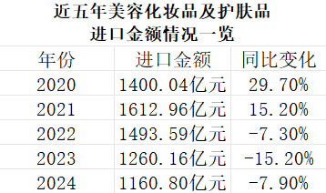 2024年化妆品进口金额又跌了!