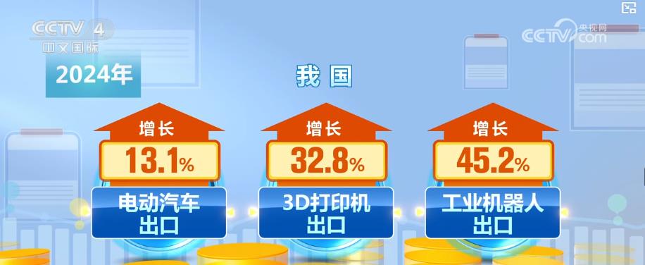 我国外贸出口布局持续优化,更多高科技属性的新产物加快出海。2024年,我国电动汽车、3D打印机、工业机械人出口别离实现了13。1%、32。8%、45。2%的增加。